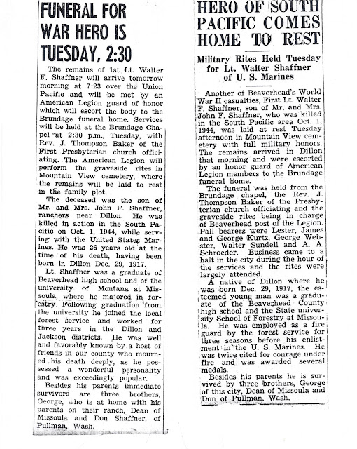 I had my day planned until I opened a tote of family memorabilia. Apparently the angels(thanks Dad & Donnee) have been tapping me on the shoulder again. It is the only explanation today that found me opening this tote. Nor did I intend to spend the day looking & reading all that was in it! It was a tote box that I have been wanting to sort, but certainly didn't anticipate that it would include all these treasures. The tote contained ALL the letters my uncle, Walter F. Shaffer, sent home to his parents during World War II. There was papers, letters and information I have never seen before. Because my grandfather was a telegrapher for the railroad and used carbon paper; he liked carbon copies of EVERY document and he kept every document concerning the death of his son, Walter F. Shaffner. Walter died 1 October 1944 in the battle at Peleliu Island, Palou Islands. There are notice of his death from the Marines, letters of condolences from the Marines, a letter of condolence from Representative Mike Mansfield, railroad bill of lading of his personal effects, telegrams that his parents sent to his brothers, Don & Dean and letters from soldiers who served with Walter. There is correspondence with the military concerning his insurance, headstone, letters from the funeral home in Dillon, letters to/from the military concerning his last pay. There were touching letters from fellow soldiers that he had served with. I haven't had time to go through the letters he wrote home. (and I may need help with that project!)